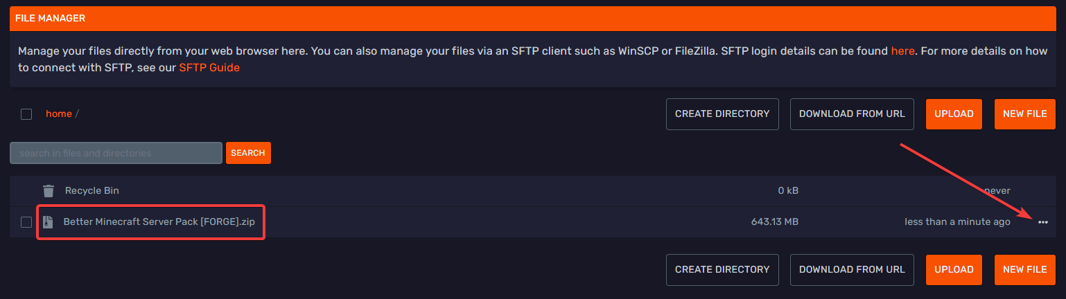Server packs contain a lot of files, so you will need to connect through SFTP to upload the archived file. You can follow our guide on How to connect through SFTP. After you connect through SFTP, you can just drag and drop the .zip to the SFTP server.