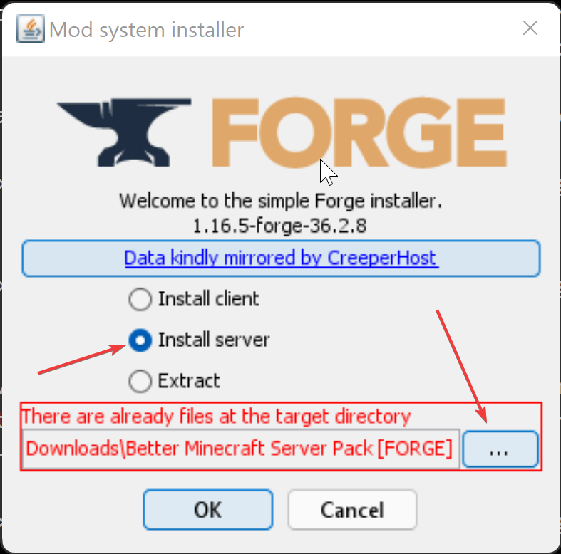 After starting the Forge installer .jar, you will be presented with 3 options. We need to select the option that says "Install server", then click on the three dots to select the directory where Forge needs to be installed. This directory needs to be the directory where you previously extracted the server pack files.